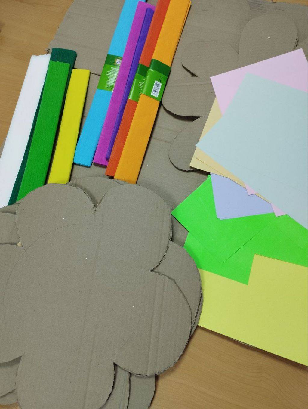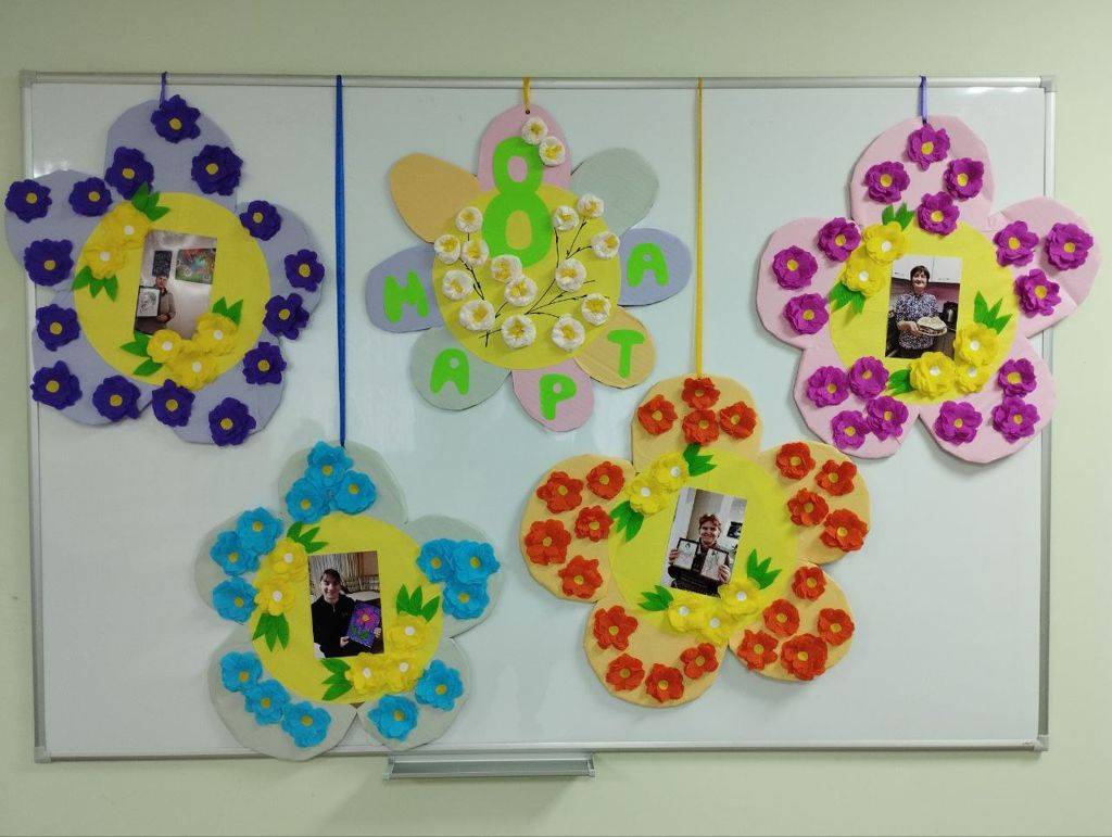 Из картона вырезали лепестки цветов, а из гофрированной бумаги соорудили небольшие цветочки для декора. В центр цветка приклеили фотографии девушек.