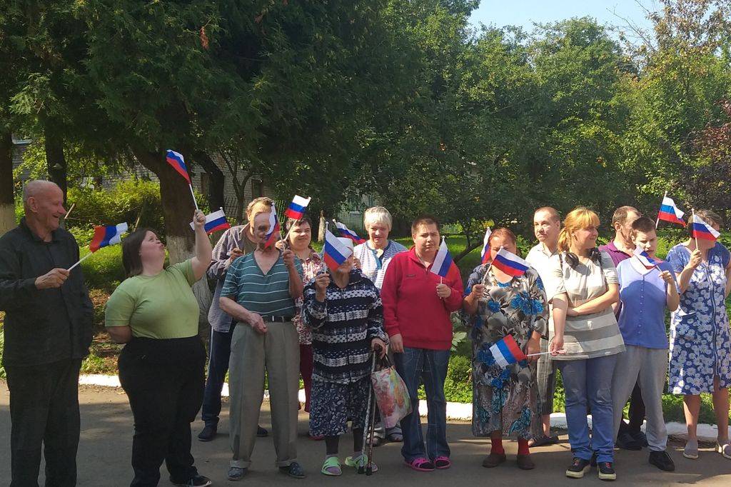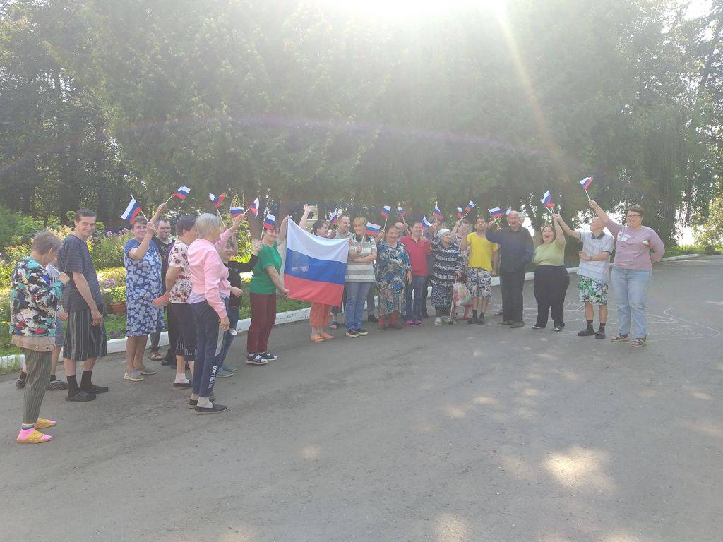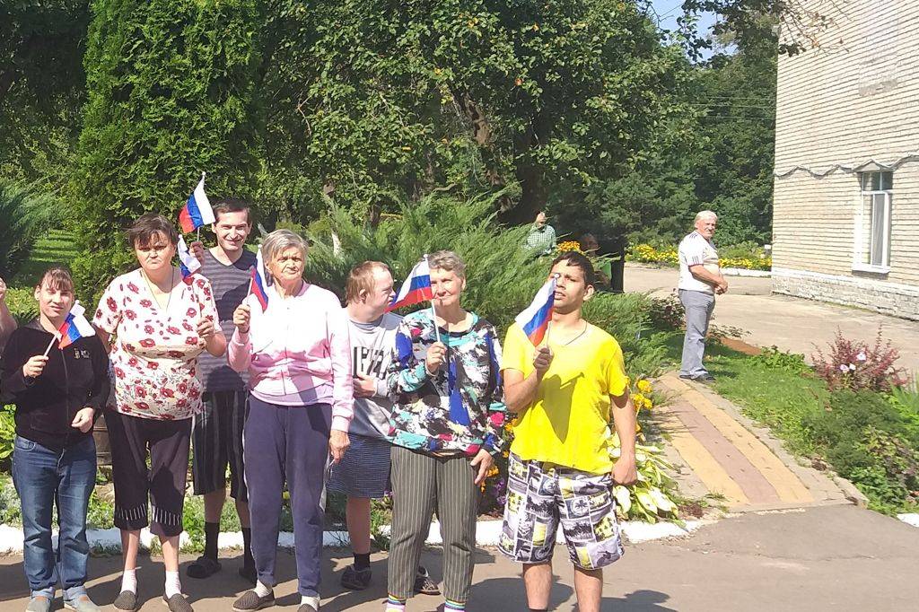 Воспитатель провела тематическую беседу с проживающими. Рассказала историю праздника, пояснила значение цветов флага, раздала каждому маленькие флажочки.