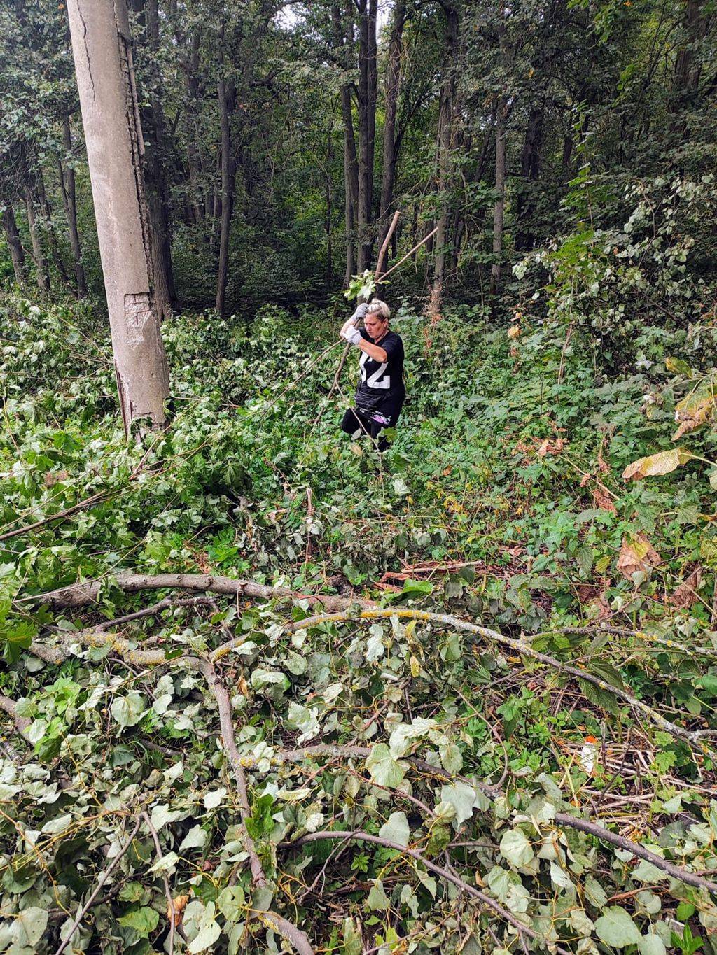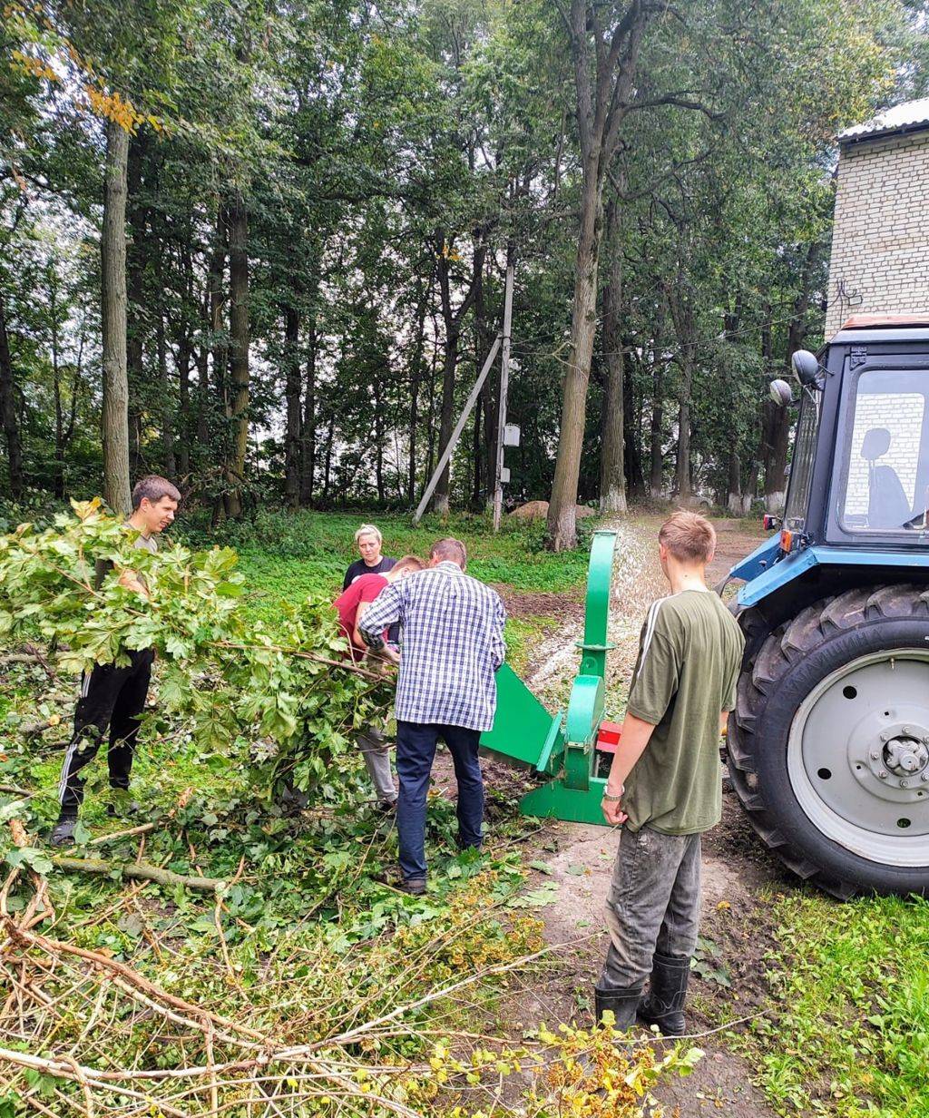 Потом собирали остриженные ветки и превращали их в щепу. Щепа пригодится зимой, в качестве укрывочного материала.