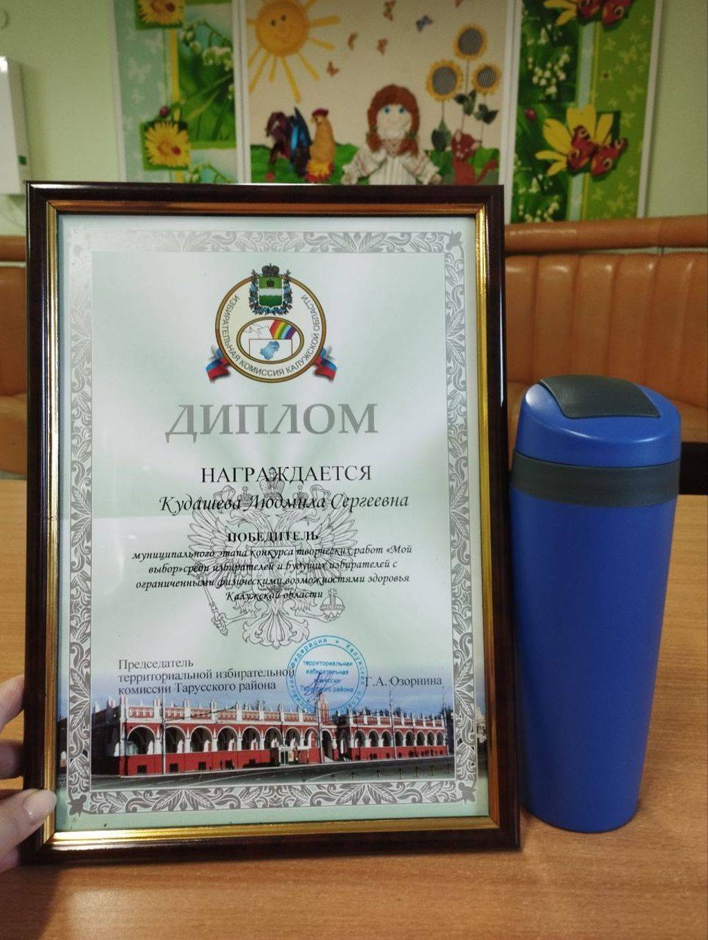 Наша участница Людмила Кудашева не смогла лично присутствовать на концерте. Вместо неё диплом победителя и подарок получала воспитатель Марина Владимировна Курочкина — как куратор Людмилы.