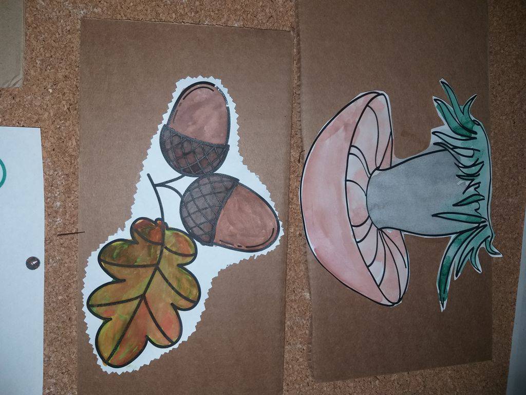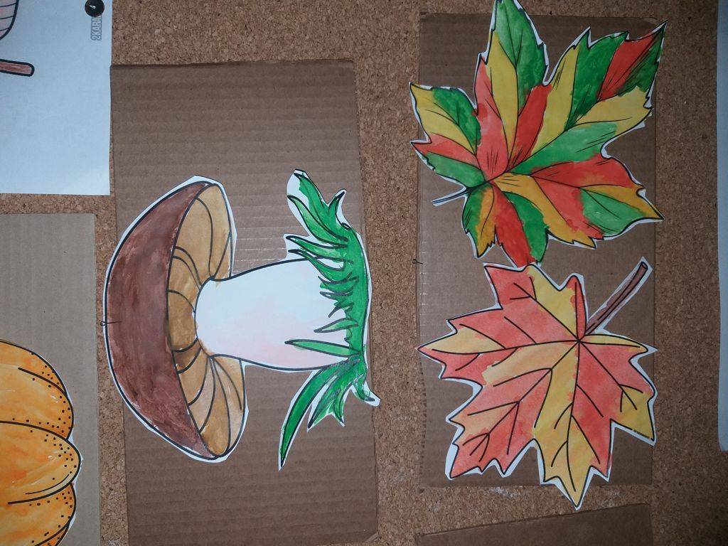 После просушки вырезали рисунки, наклеили на картон и развесили на стендах. Небольшие осенние символы в дополнение к золотой осени.