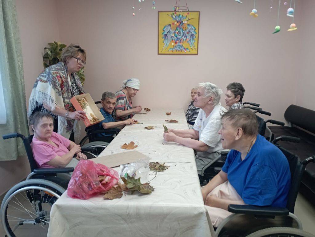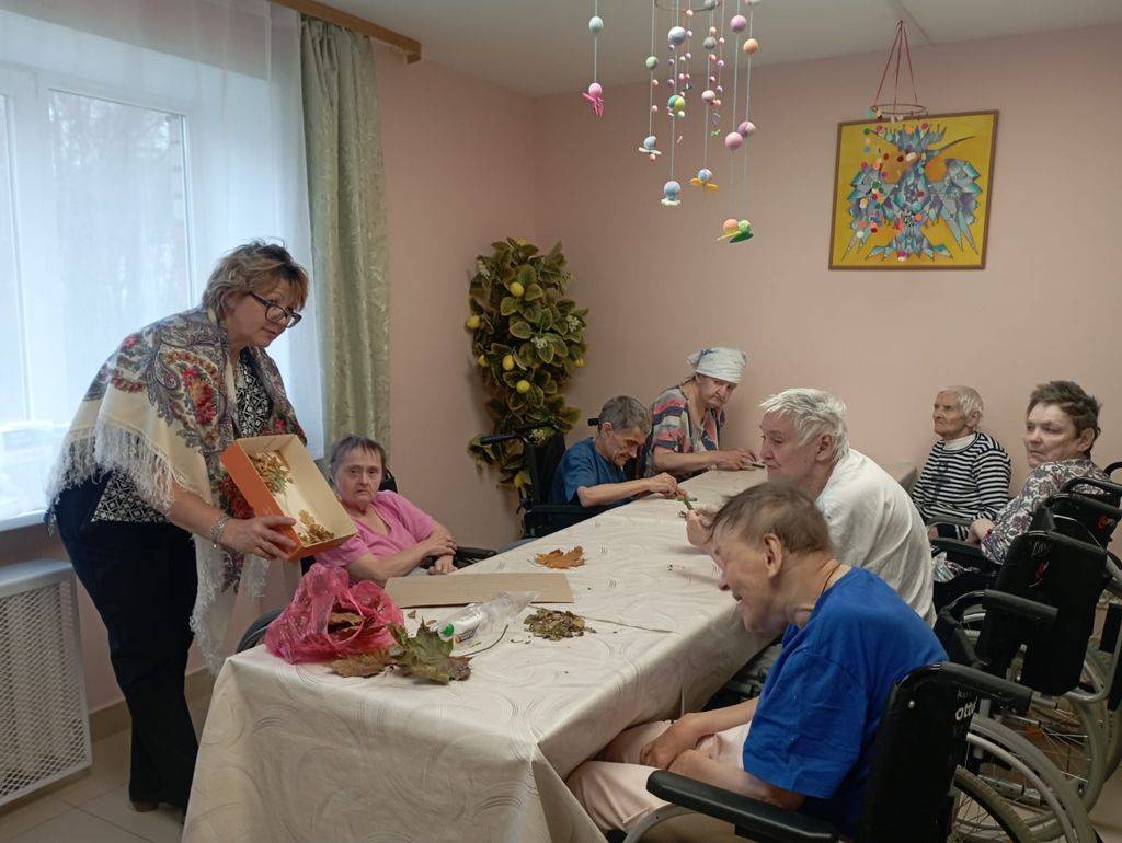 Пожилым людям полезны упражнения для моторики, поэтому всем понравилась затея вручную перетирать листья. Понравился и звук — шуршание сухих листочков — будто шагаешь по осенней поляне в лесу.