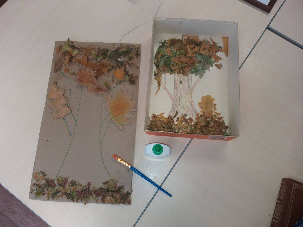 В работе использовали клей, гербарий и картон. На картоне нарисовали контур дерева, измельчили заранее собранные и подсушенные листья и приступили к созданию цельного образа.
