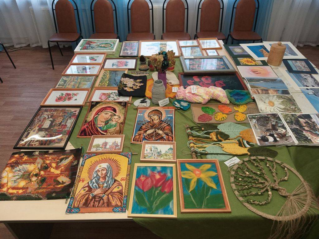 Дальше прошли к статичной выставке. Рассмотрели вышитые крестом картины Татьяны Антоновой, нашей талантливой мастерицы из отделения Милосердия.