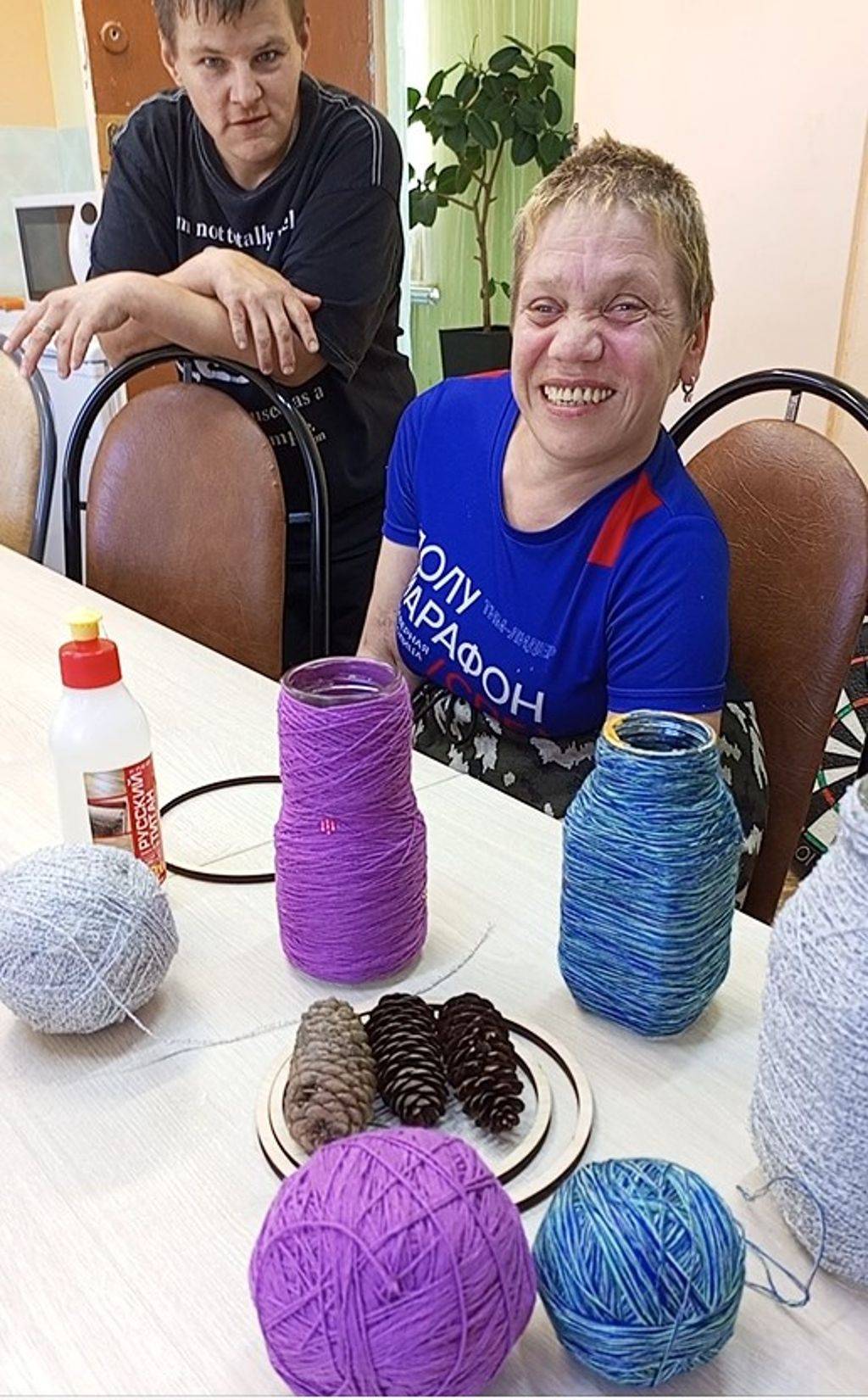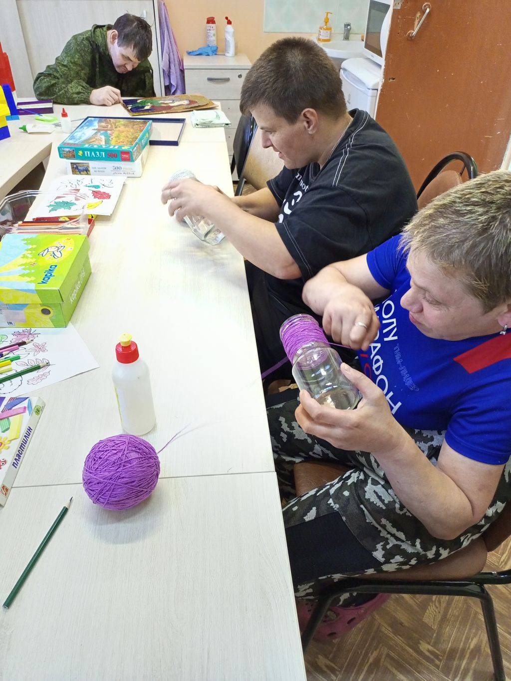 Воспитатель и проживающие психоневрологического отделения провели увлекательное занятие по декупажу баночек с помощью пряжи.