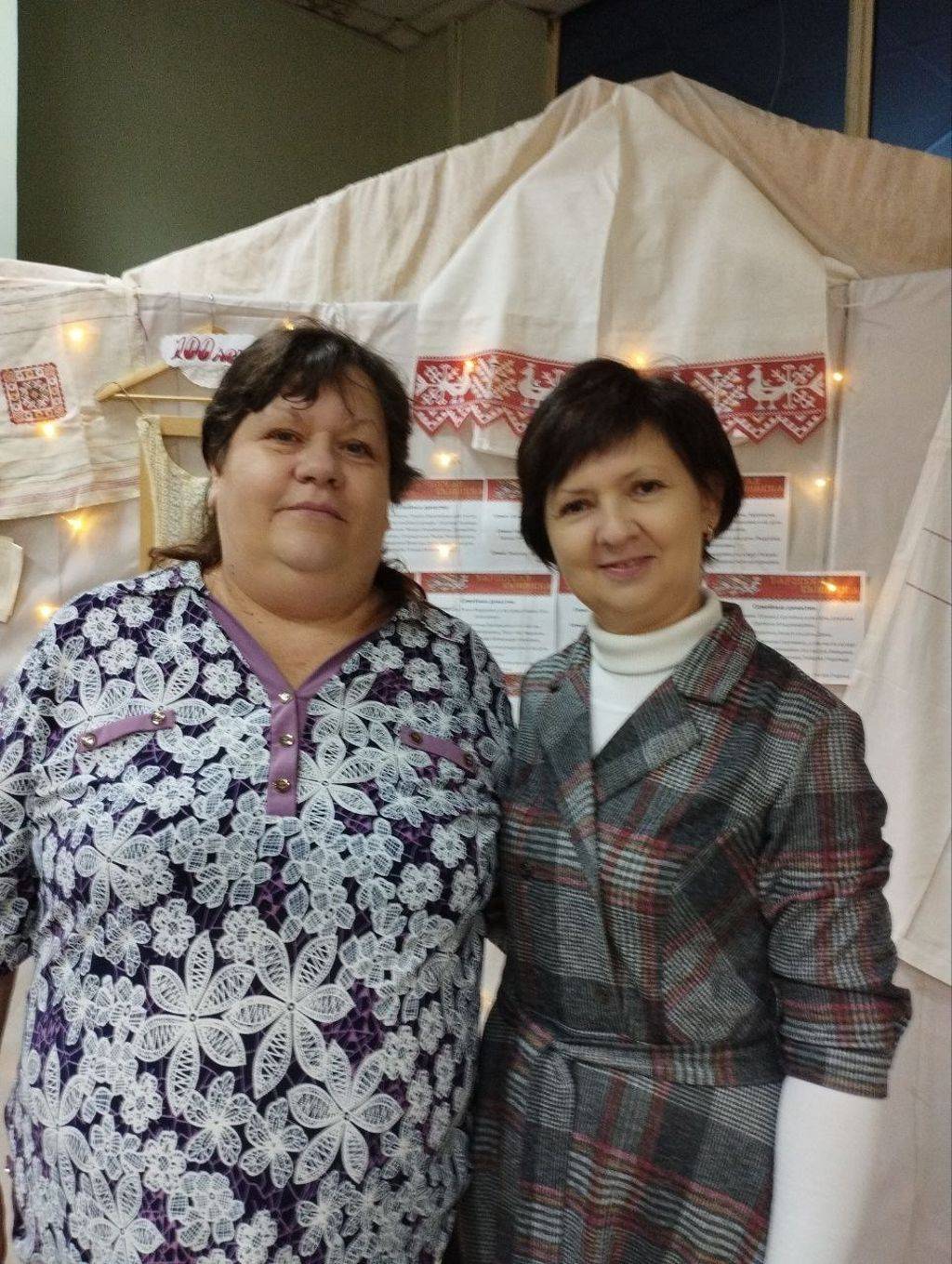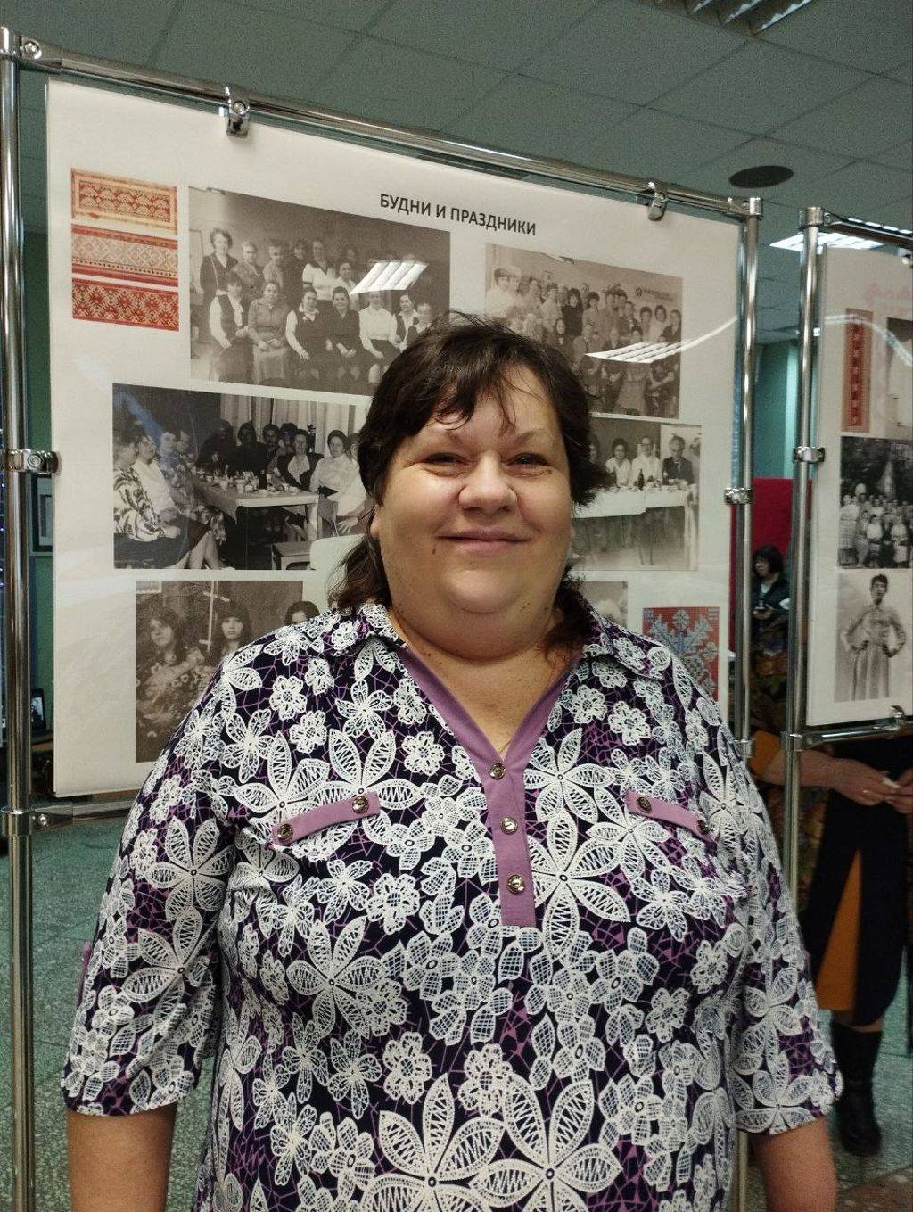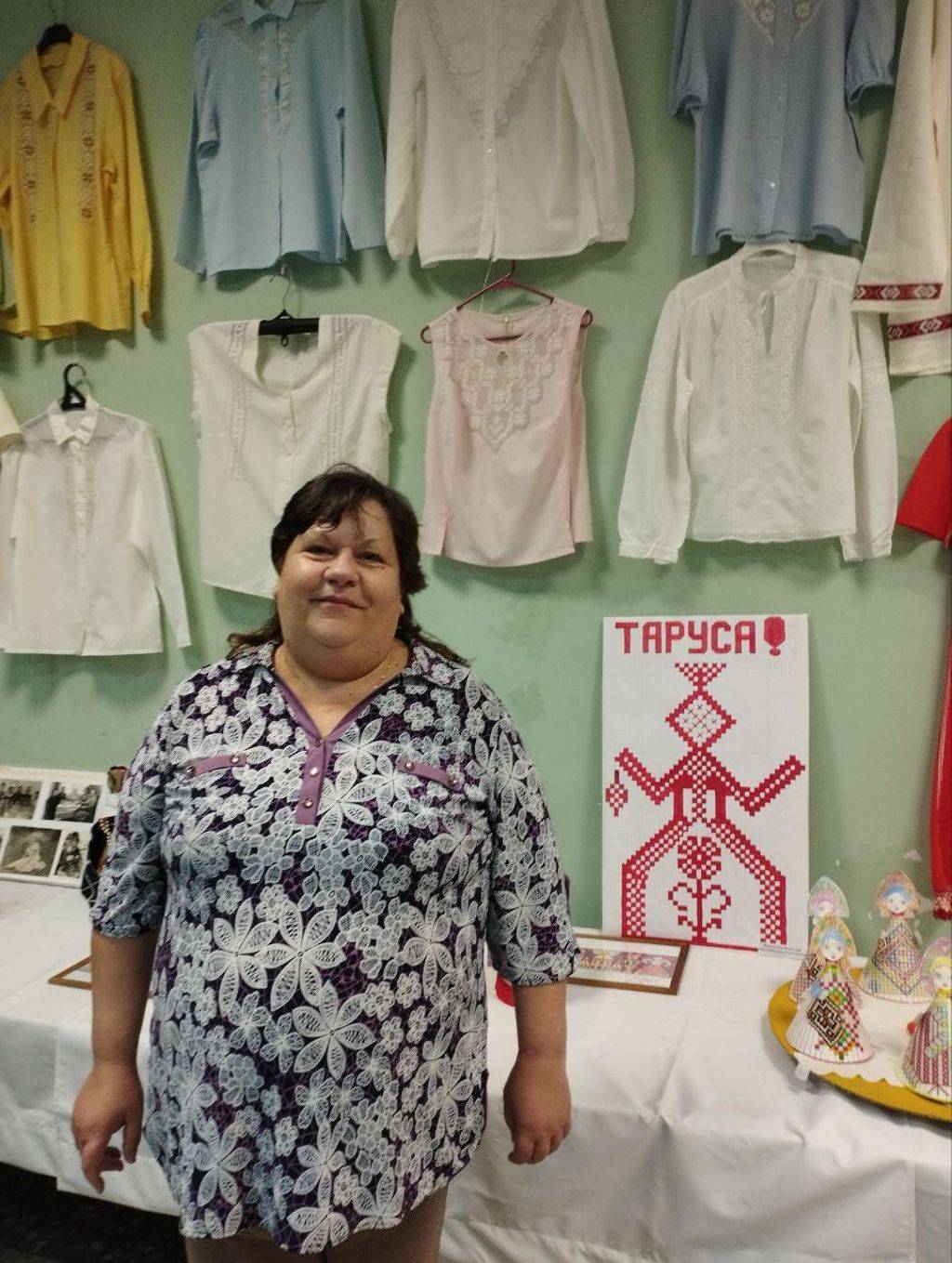 В киноконцертном зале «Мир» Ольга Викторовна с большим интересом рассматривала выставку с изделиями тарусских вышивальщиц разных лет, фотографии, на которых запечатлена вековая история фабрики.