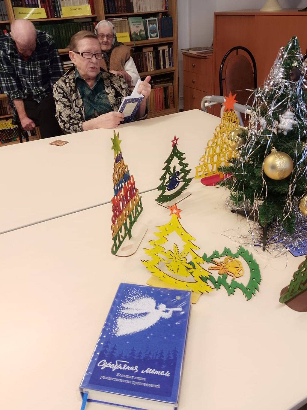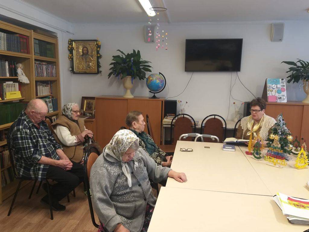 В эти праздничные «каникулы» в читальном зале для проживающих отделения Милосердие библиотекарь устроила громкие чтения. Читали стихи и рассказы вслух по очереди. Тематику произведений выбирали новогоднюю, зимнюю и рождественскую. В актовом зале, на импровизированной дискотеке, все желающие могли поплясать под атмосферный праздничный плейлист от культорганизатора.