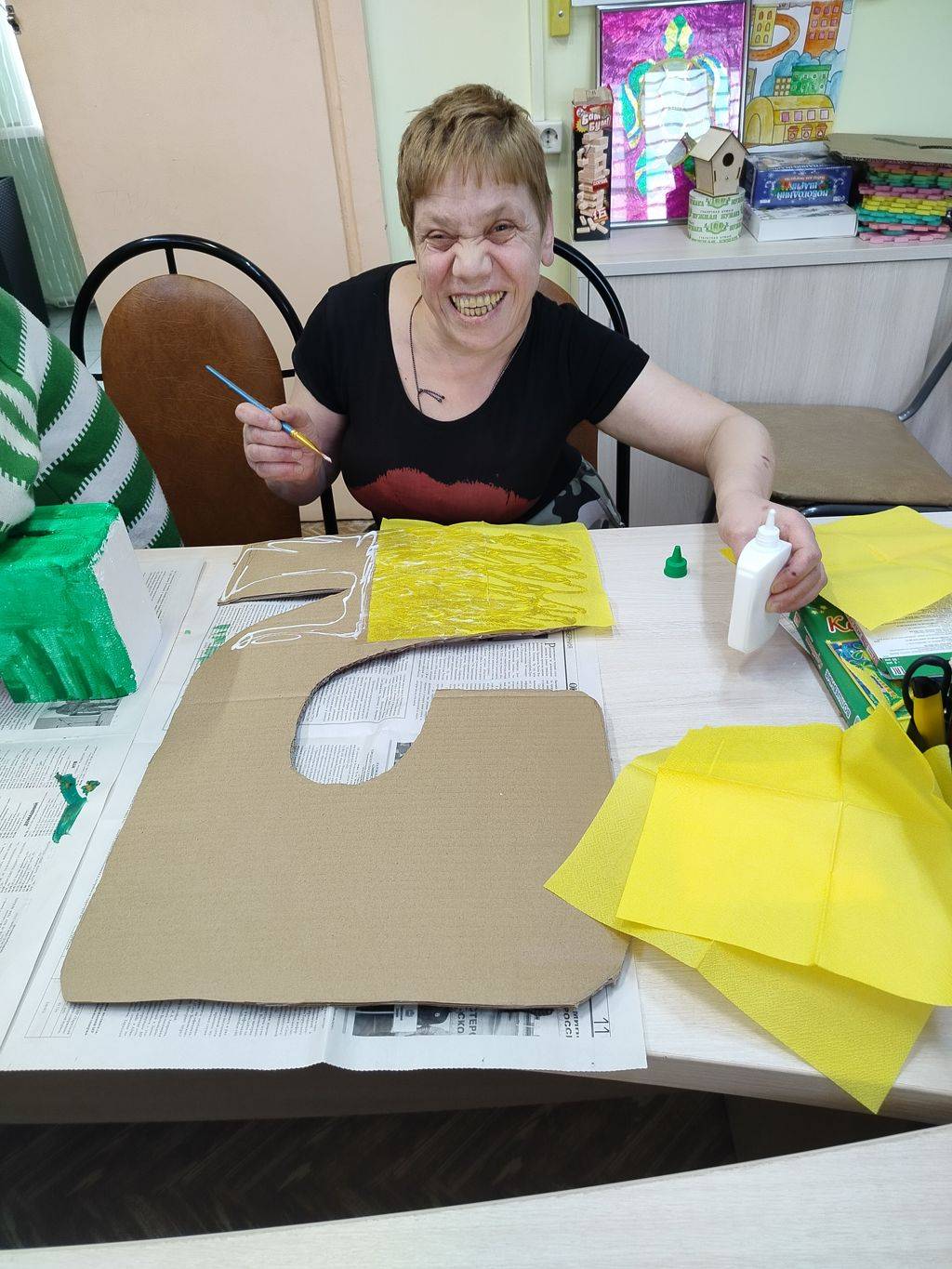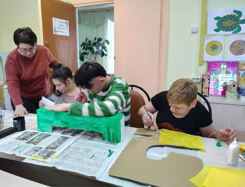 Ребята из психоневрологического отделения к празднику подготовили тематическую инсталляцию. Работа коллективная — кто клеил, кто вырезал, кто раскрашивал.