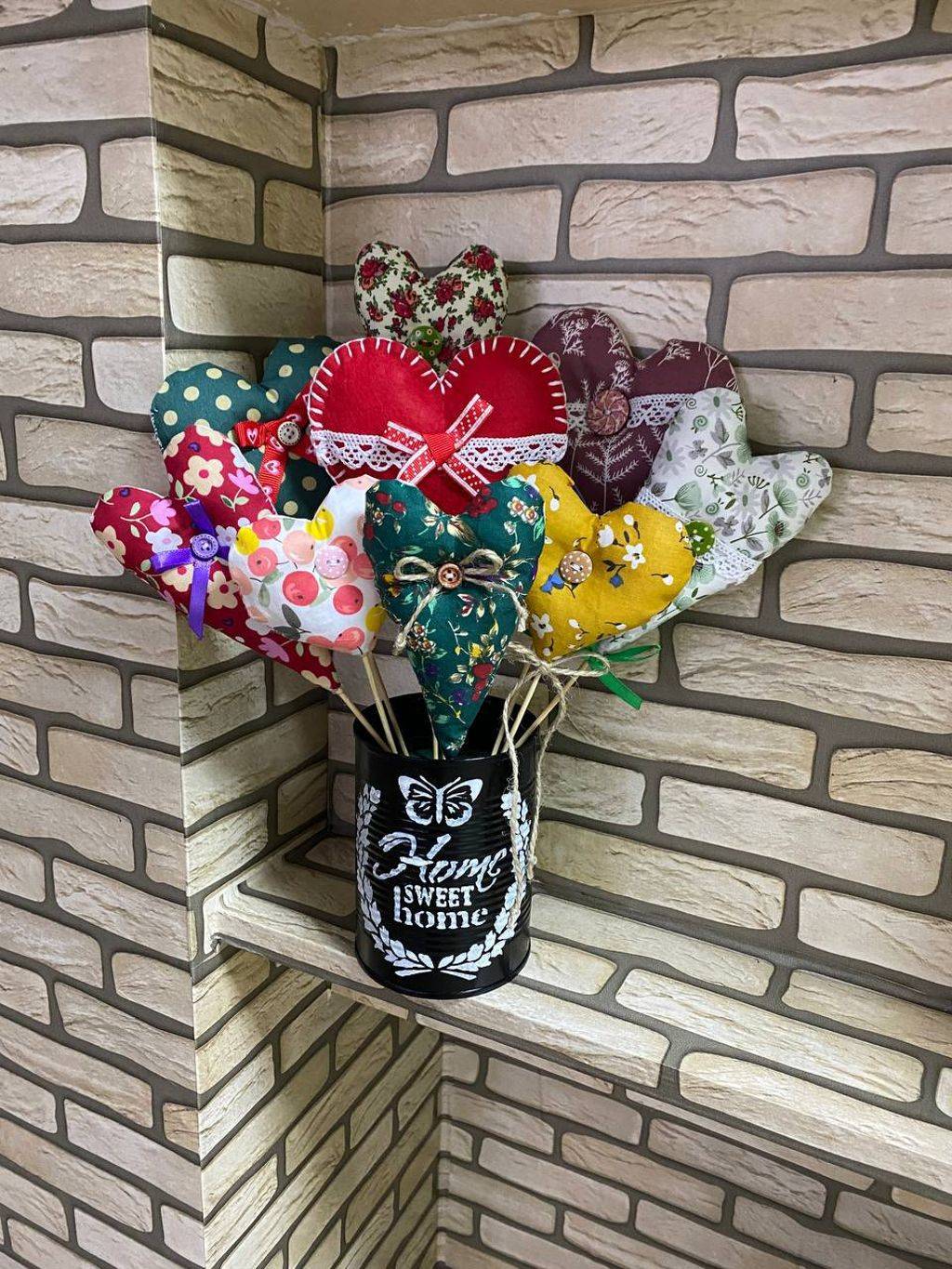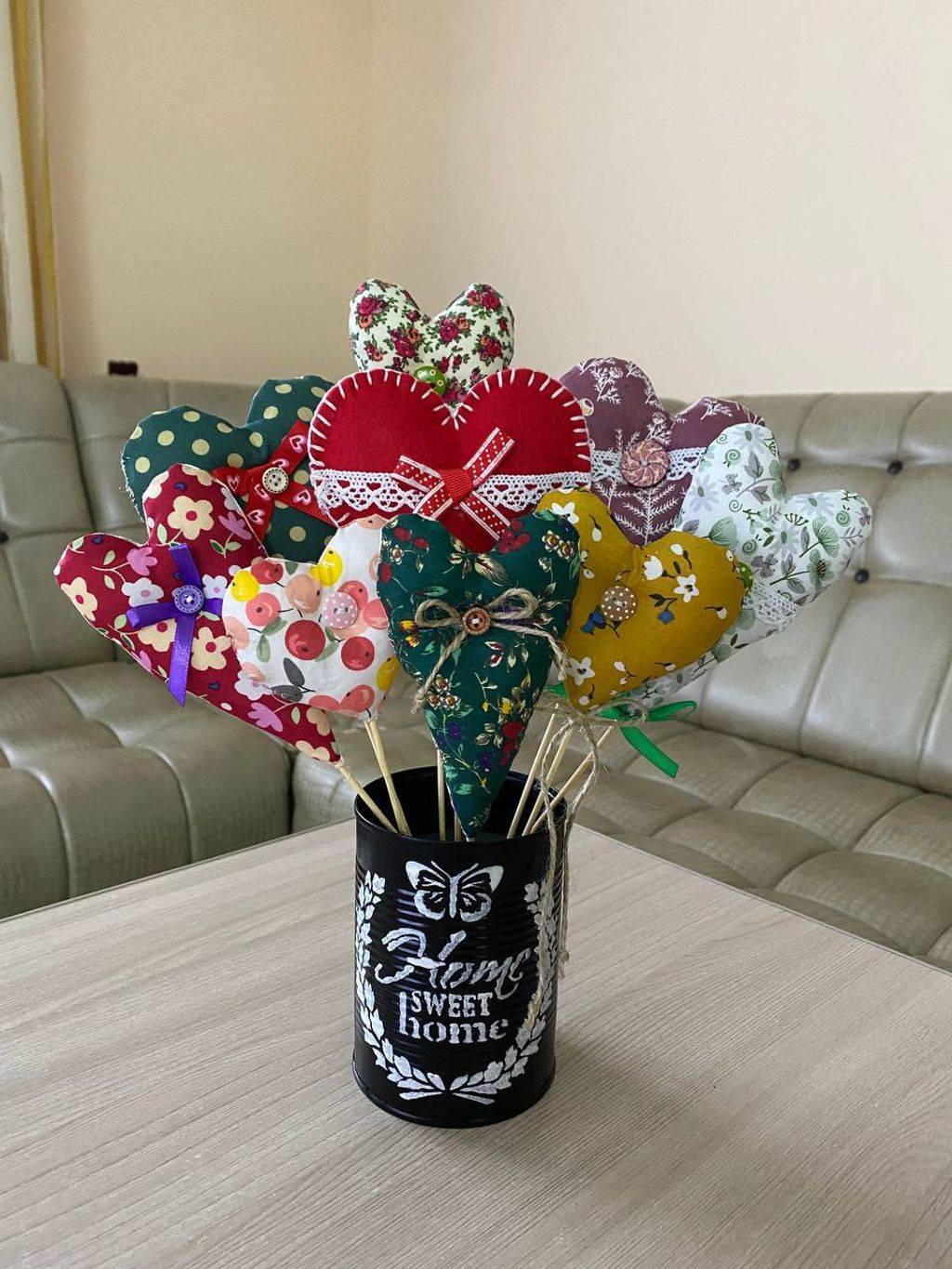 Украсили сердечки пуговицами, бантиками из лент и джута, в каждое сердечко вставили шпажку. Получился целый букет.