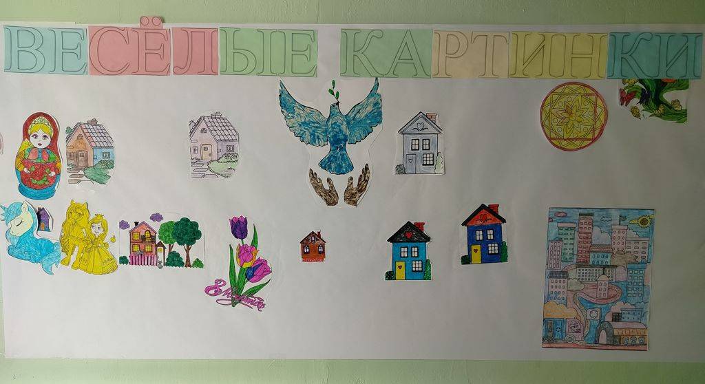 Закрепили на стене плотную белую бумагу, и на эту «ленту» приклеивали свои рисунки, раскраски, пластилиновые картины. Выставку назвали «Весёлые картинки». Ребятам очень нравится и смотреть на свои работы, и показывать их. Они хвалят друг друга за выбор цветов, или аккуратность, или просто красивый рисунок.