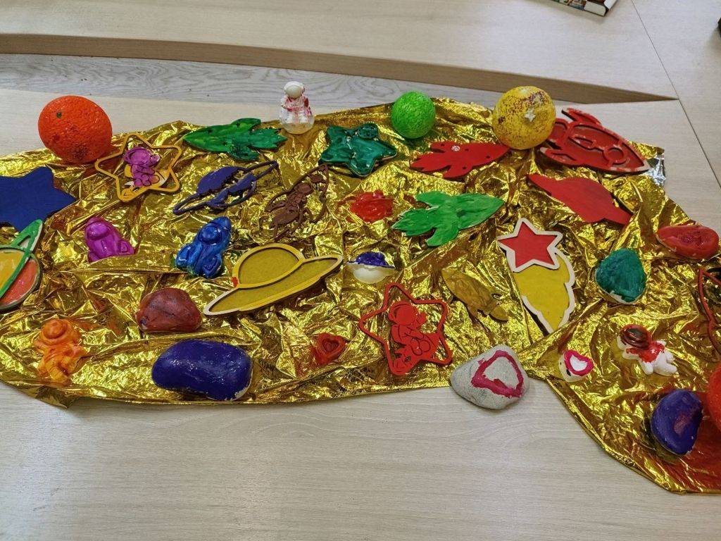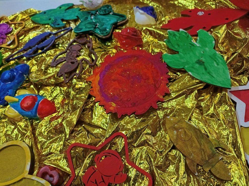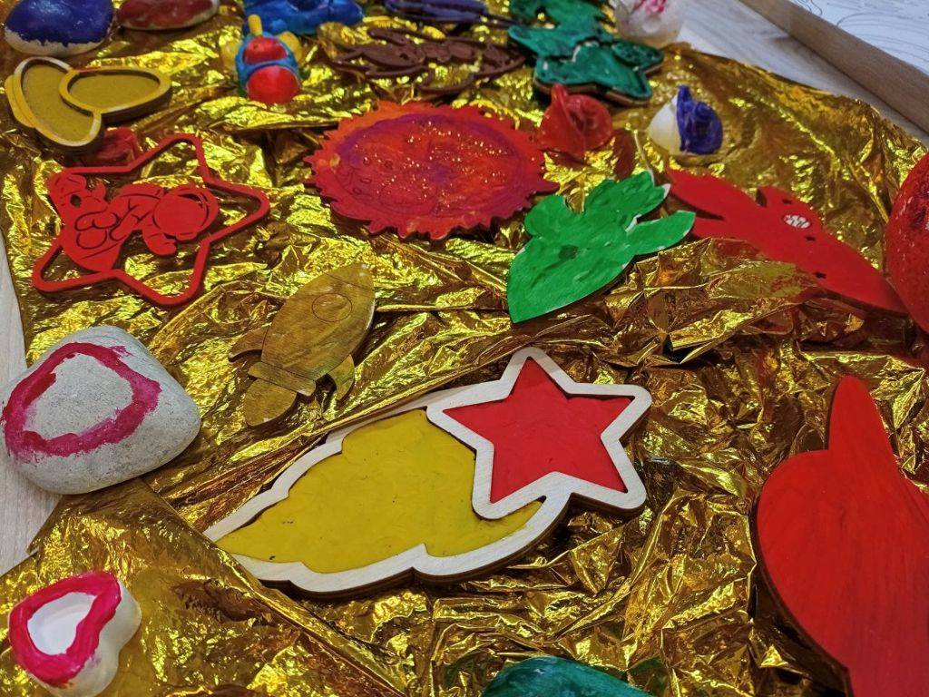 ️В работе использовали деревянные шаблоны, гуашь ярких цветов и фантазию. ️Раскрашивали ракеты, планеты, звёздочки и фигурки космонавтов.