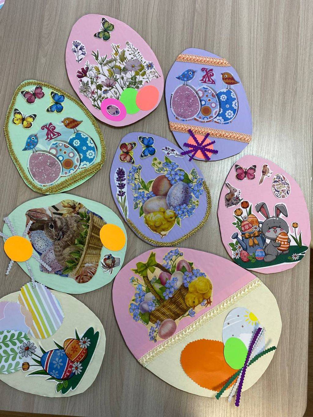 В работе использовали картон, бумагу, гуашь и природные материалы — яичную скорлупу и веточки.