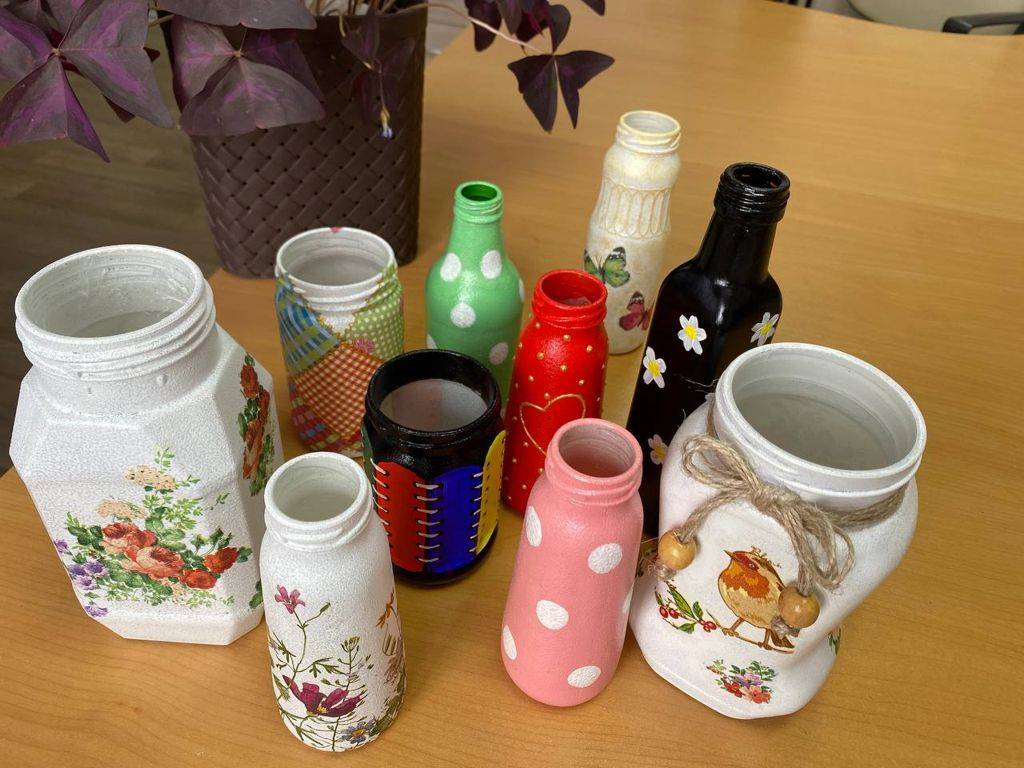 🍁Помимо декупажа можно раскрашивать баночки и бутылочки акриловыми красками.