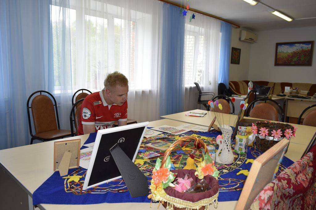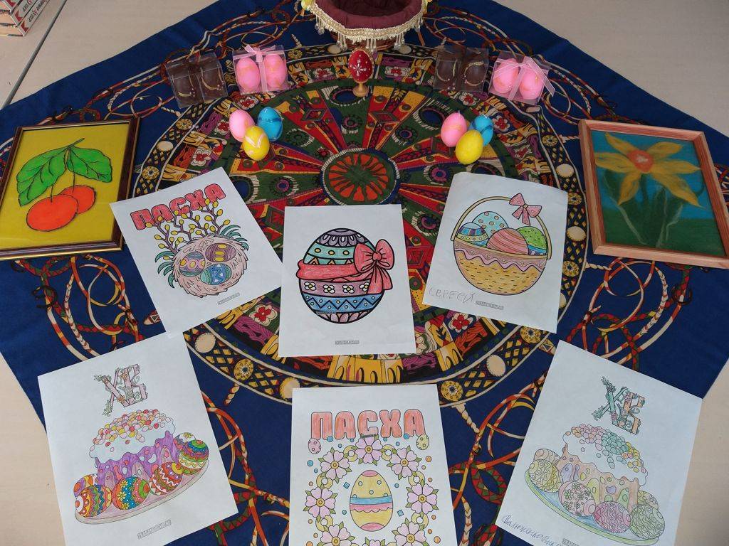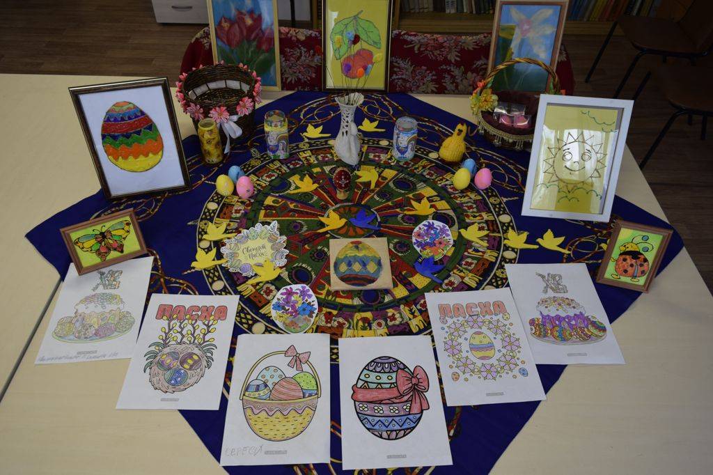 К Пасхе организовали для проживающих выставку. Небольшой тематический уголок в читальном зале. И переносная выставка в холлах для маломобильных граждан.