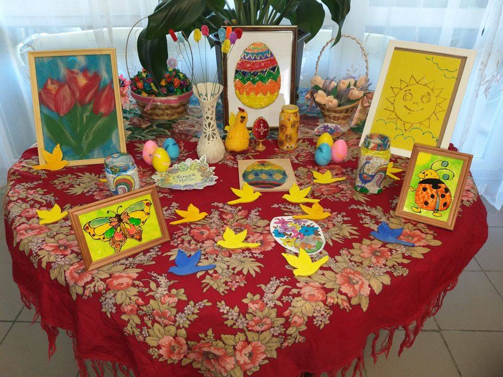 Раскрашенные ребятами вручную деревянные птички и рисунки в тему праздника