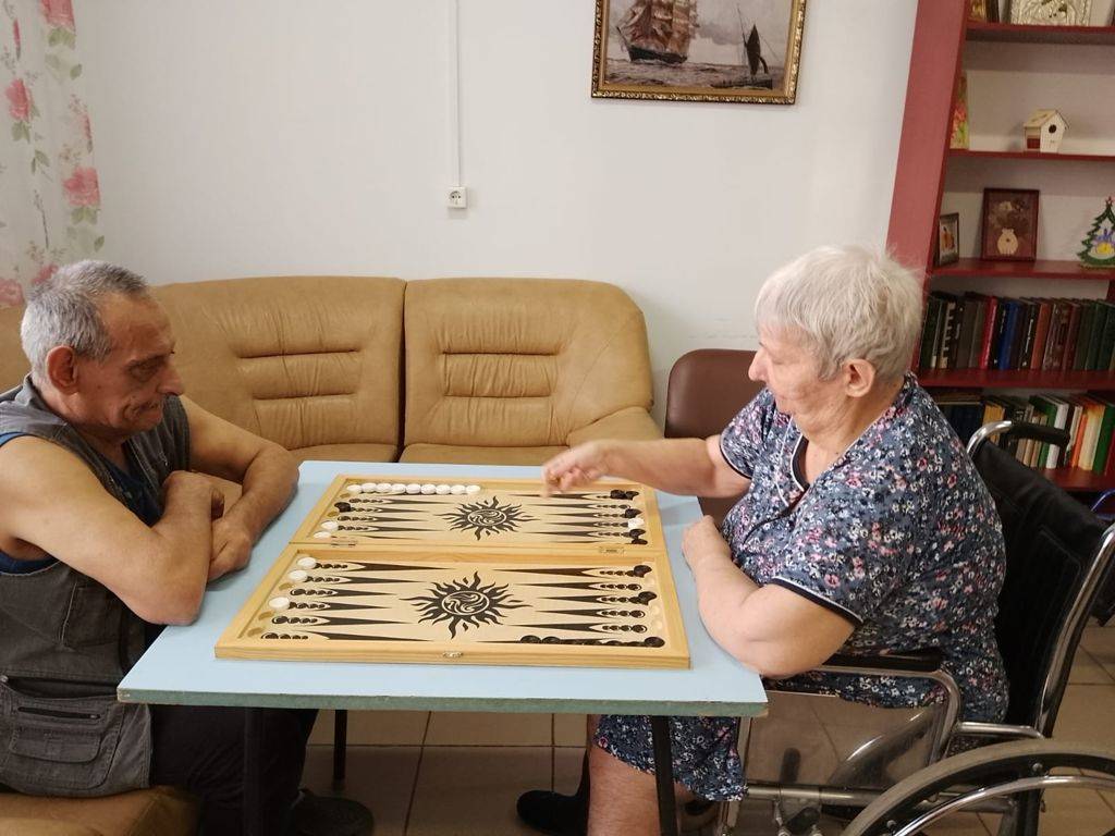 Зимние вечера, когда для прогулки уже темно и холодно, проживающие отделения милосердия Мухамадиев Александр и Кожакина Надежда проводят за игрой в нарды.