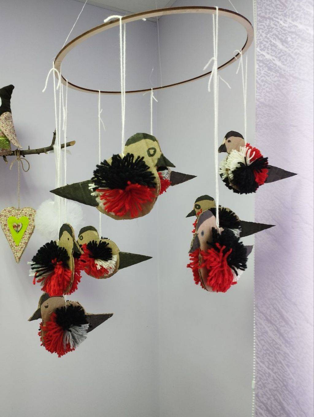 Последним шагом мы аккуратно вставили ножницы между двумя деталями, затянули нитку посередине, чтобы птички получились пушистыми.