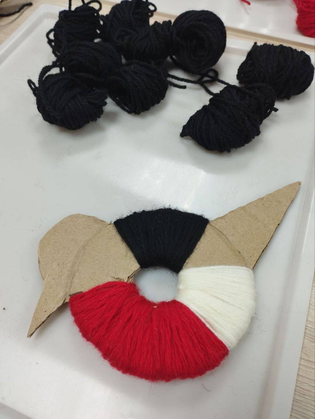 Сначала заготовили шаблоны будущих птичек, затем вязальными нитками чёрного, белого и красного цветов обматывали картонные детали.