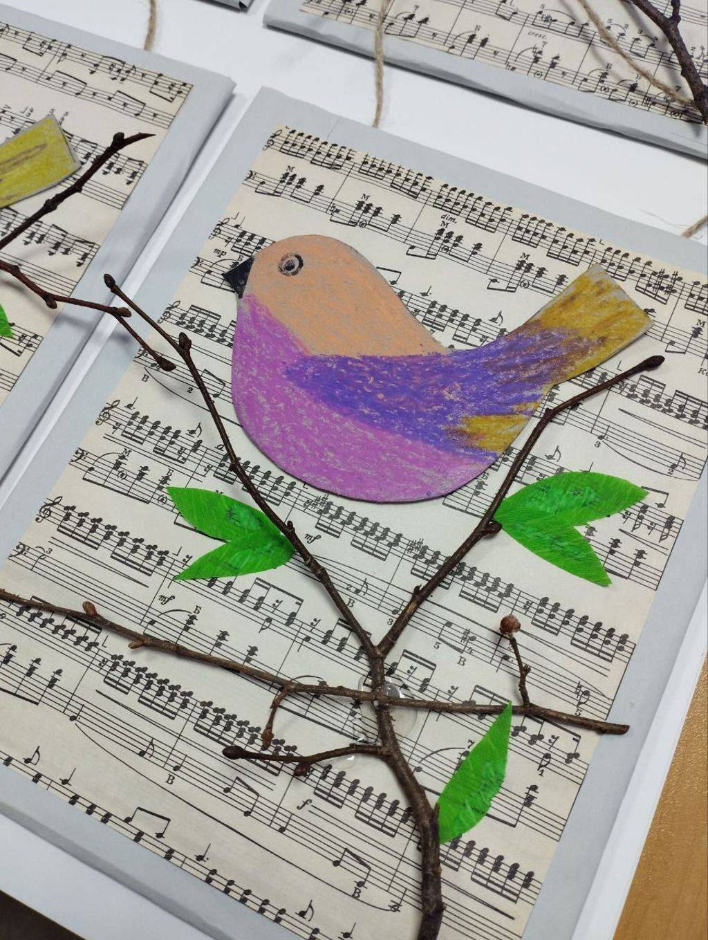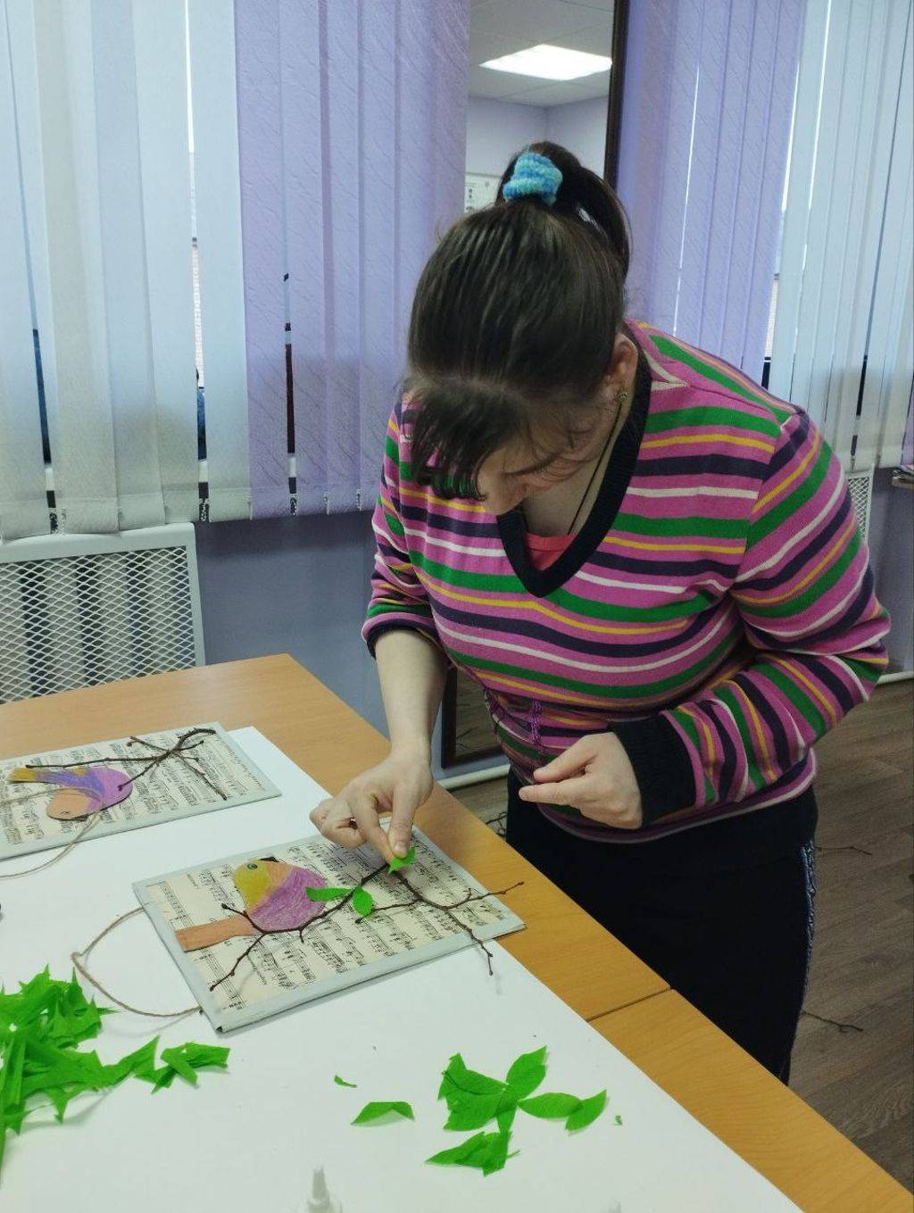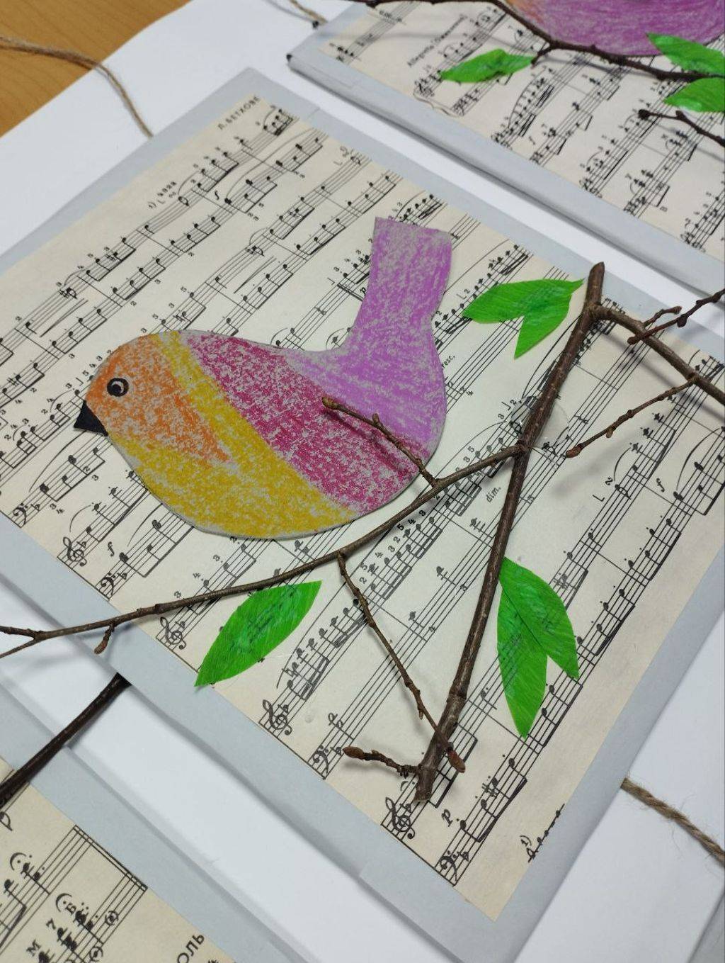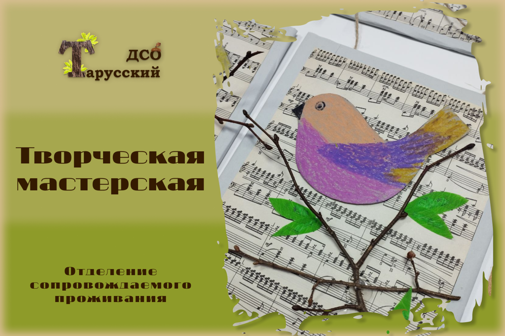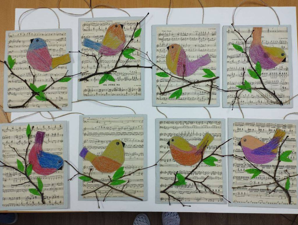 Природный материал, старый нотный альбом, картон и цветную бумагу использовали проживающие отделения сопровождаемого проживания для создания весенних птичек.