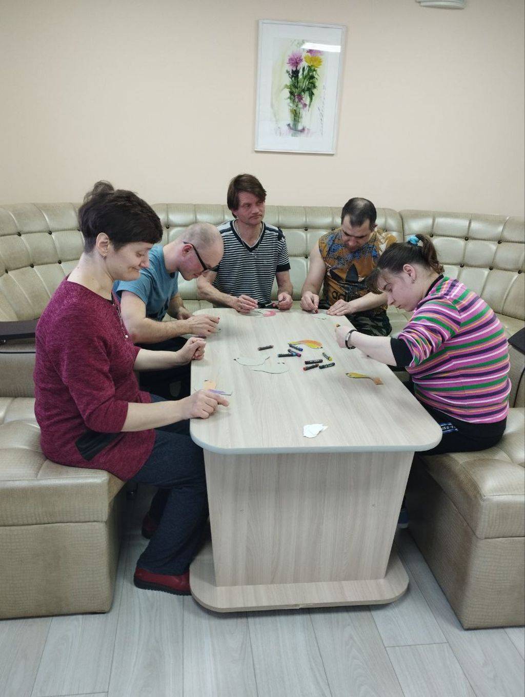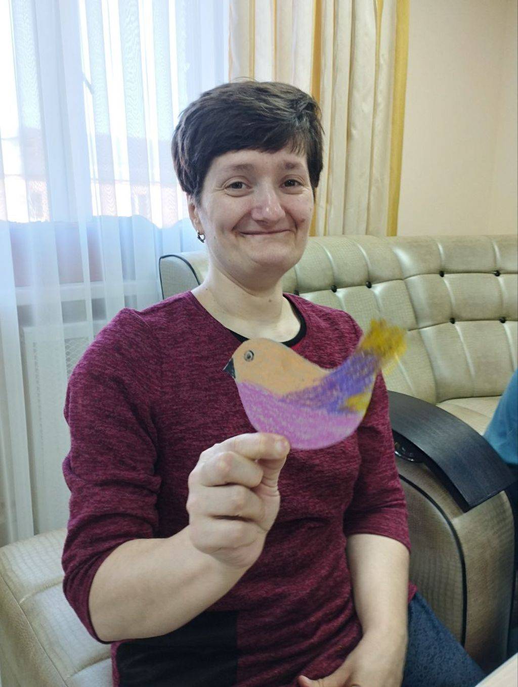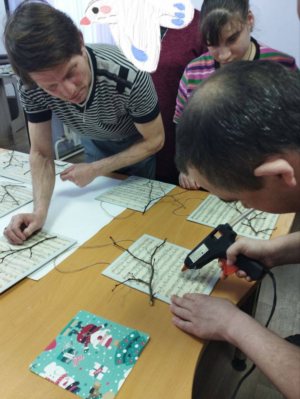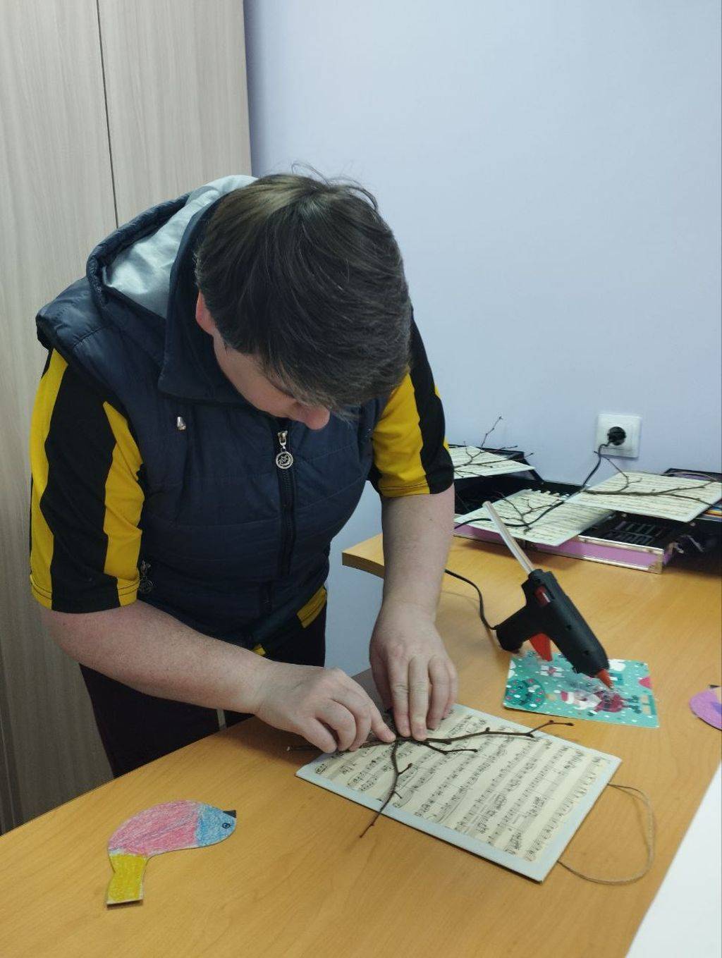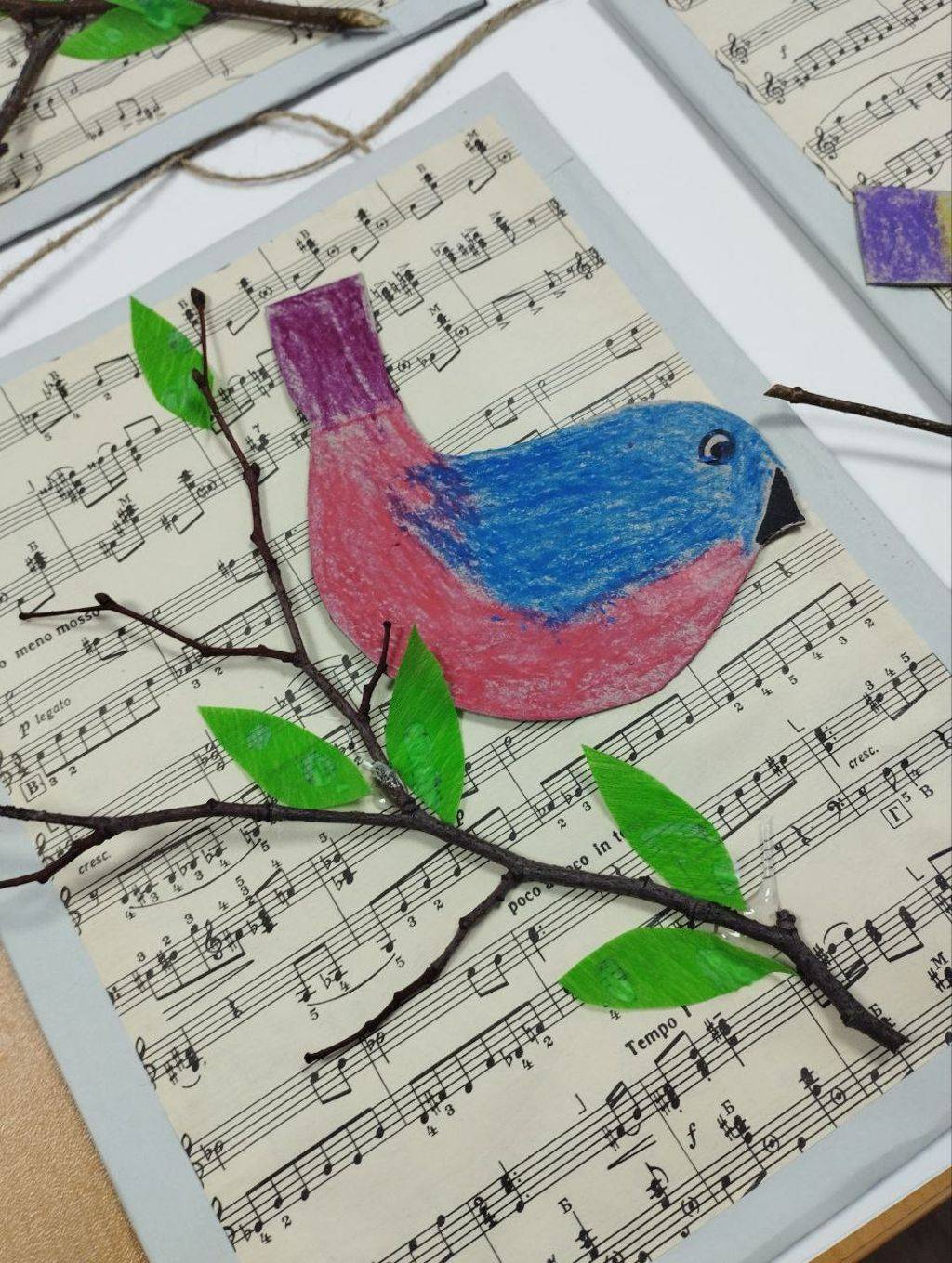 Природный материал, старый нотный альбом, картон и цветную бумагу использовали проживающие отделения сопровождаемого проживания для создания весенних птичек.